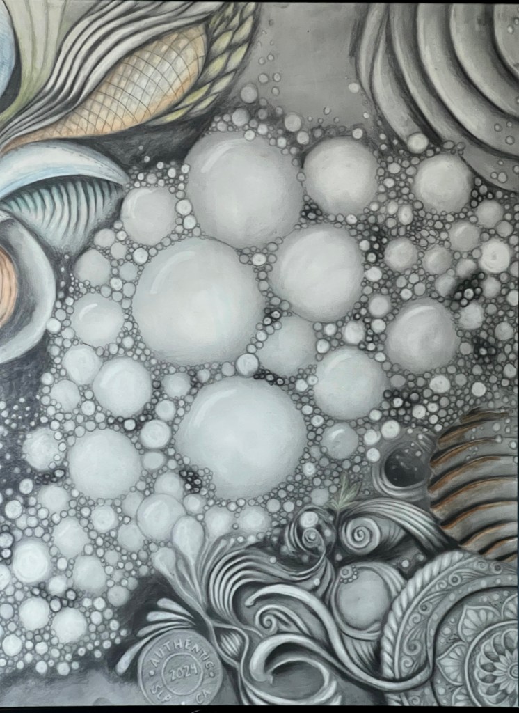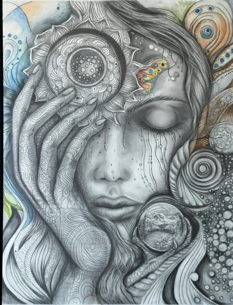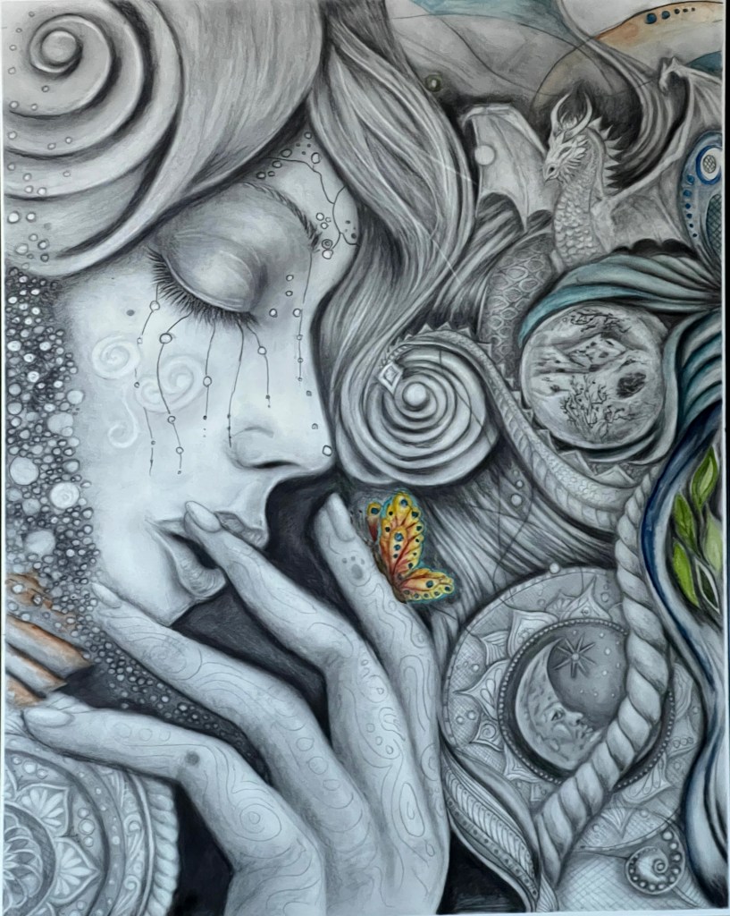 2024: Graphite, charcoal, watercolor on paper. “The transformation” In this triptych, two serene faces emerge in a celestial dreamscape, their closed eyes reflecting inner worlds and unspoken narratives. Iridescent butterflies dance around a swirling bubble, while a coiling dragon weaves beneath sun and moon sigils, framed by the ancient rhythms of the Mayan calendar. A…